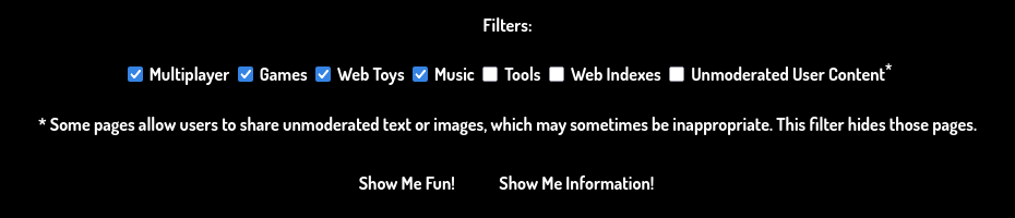 - Added page filters (Multiplayer, Games, Web Toys, Music, Tools, Web Indexes and Unmoderated User Content)